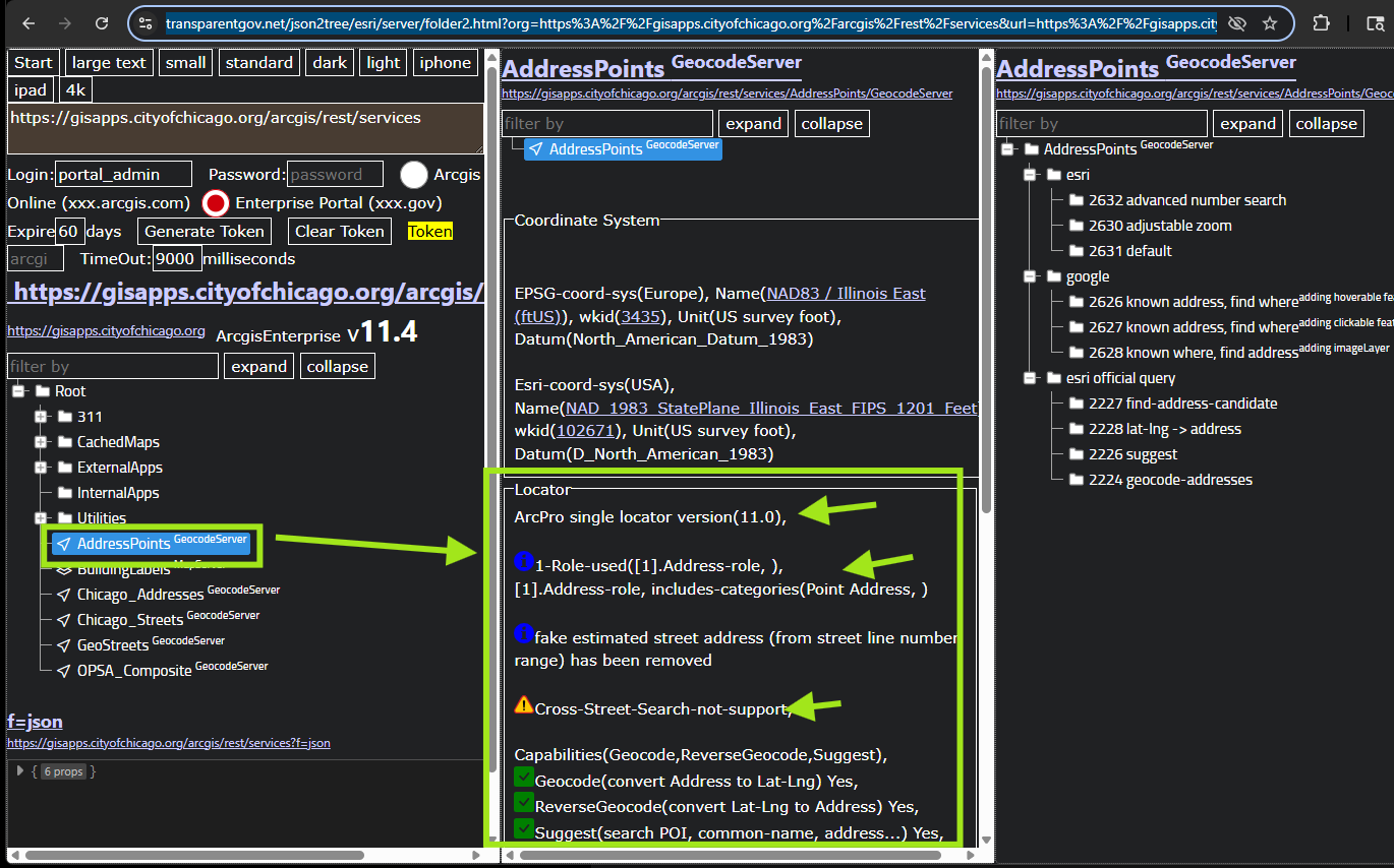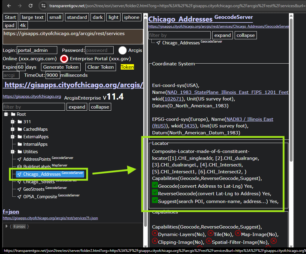https://transparentgov.net/json2tree/esri/server/folder2.html?org=https%3A%2F%2Fgisapps.cityofchicago.org%2Farcgis%2Frest%2Fservices&url=https%3A%2F%2Fgisapps.cityofchicago.org%2Farcgis%2Frest%2Fservices&arcgis_online_token=&timeout=9000&select_folder=8&select_layer=&select_folder_text=Chicago_Addresses+%3Csup%3EGeocodeServer%3C%2Fsup%3E&select_layer_text=AddressPoints+%3Csup%3EGeocodeServer%3C%2Fsup%3E