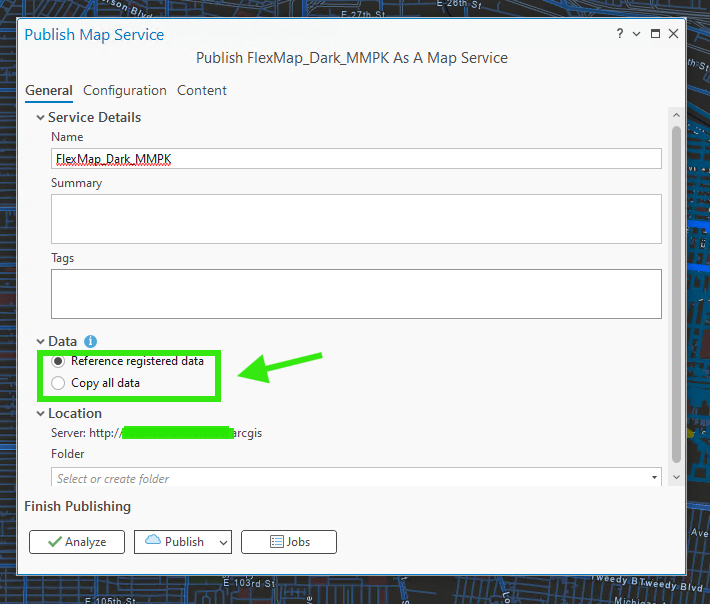 publish map server, there is option to ask you if you want to use reference data or copy data over to server.