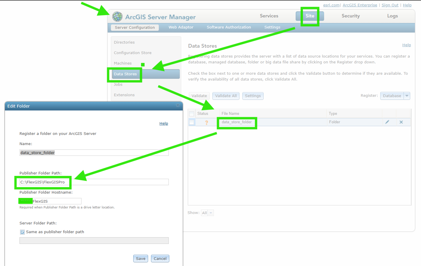Check what existing folder has been registared with Arcgis server, click site, data store, then click folder