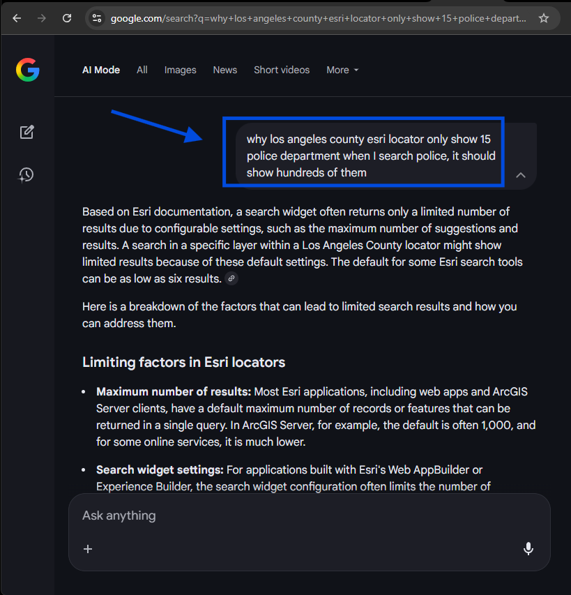 https://www.google.com/search?q=why+los+angeles+county+esri+locator+only+show+15+police+department+when+I+search+police%2C+it+should+show+hundreds+of+them&sca_esv=d029728c4f6818f7&rlz=1C1RXQR_enUS1149US1149&sxsrf=AE3TifOXvw230zafw8hfilwN1OvJ7VUZHw%3A1761265497815&udm=50&fbs=AIIjpHxU7SXXniUZfeShr2fp4giZ1Y6MJ25_tmWITc7uy4KIejIPgyyGM1YJJNz-u26A7UQjdzW_3QjQoz5M3kGxMbP-wuxMoVpDZPatYZQ691MZwuENsQ2KoggtwQbGFHswMP11S_bmLrb4T-exiqxWzReUsU3VR6LFZCgoLNlqiRqVl0xuIX1dVKh793lhzDHBKKewiAoED6OGGCX_bTpEuPqtZHFB4Q&aep=1&ntc=1&sa=X&ved=2ahUKEwje1OiiybuQAxV2OEQIHcDLBJ8Q2J8OegQIDRAE&biw=1920&bih=945&dpr=1&mstk=AUtExfD4vUFjonRwVtW_OuEMBRyjSlFbBwUAtT3uMPj9vjgBSSUn2iBnz2x0TTm986Z4fs_HJxYYIIB0A9G3iGEv245qqjTOQ_THUBuIvyFiKmYpglxJQTJw3pPXqwc3ZyZpq49af5oG6YAsmduOI4zIv9pVv6SigzJo8Jc9a9hMkUXdg3H57jKUiL8Ck0rVUStLOM8ajbRdV2jcik7rIP62TxUjgDAegsya1XPVRPpN5ywv6DK_AlxsqXHpbsX6xhAjmJDA49QDh2uZF064mI_yCUz_gEfCscYw6n3tflGUgGBST7M2o9PRq5PZ8z3qfa-jpqDwztKvDsr2hQ&csuir=1&mtid=bcf6aNHfF4PDkPIPtuiD8Qs