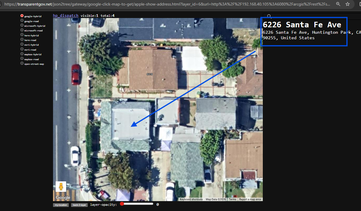 https://transparentgov.net/json2tree/gateway/apple/hover-look-around.html?layer_id=6&url=http%3A%2F%2F192.168.40.105%3A6080%2Farcgis%2Frest%2Fservices%2FGeovalidation%2FFlexMap_Dark%2FMapServer&layer=hp_dispatch¢er_lat=33.983977857108066¢er_long=-118.22983960747831¢er_zoom=0.002%2C0.002&panto=0&maptype=google-hybrid