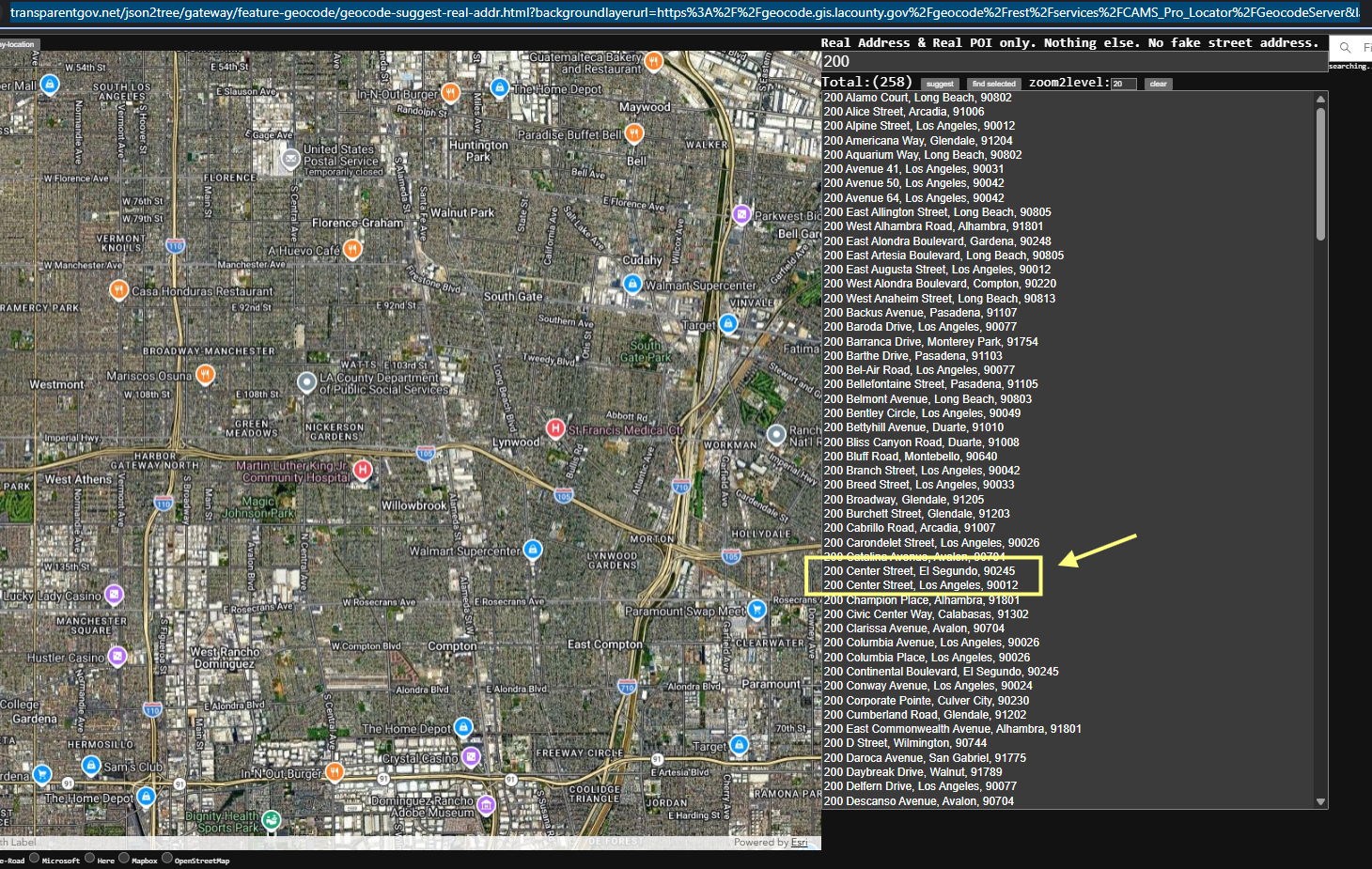 https://transparentgov.net/json2tree/gateway/feature-geocode/geocode-suggest-real-addr.html?backgroundlayerurl=https%3A%2F%2Fgeocode.gis.lacounty.gov%2Fgeocode%2Frest%2Fservices%2FCAMS_Pro_Locator%2FGeocodeServer&layer=CAMS_Pro_Locator&_center_lat=33.928799999999995&_center_long=-118.2468&_center_zoom=13&panto=0&search=200