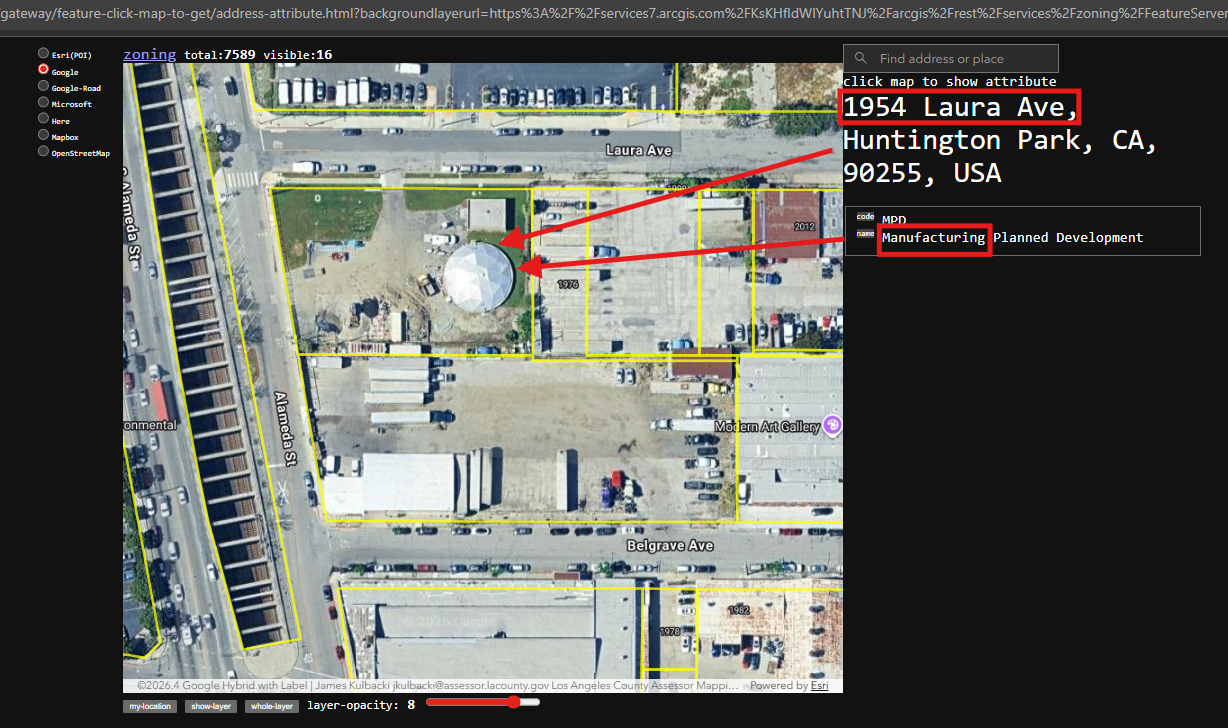 https://transparentgov.net/json2tree/gateway/feature-click-map-to-get/address-attribute.html?backgroundlayerurl=https%3A%2F%2Fservices7.arcgis.com%2FKsKHfIdWlYuhtTNJ%2Farcgis%2Frest%2Fservices%2Fzoning%2FFeatureServer%2F1&layer=zoning&_center_lat=33.98758167161121&_center_long=-118.23654622201664&_center_zoom=19&panto=0